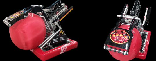 Drivetrain: 8WD, 6 CIM, VEXpro 3CIM 2 speed Ball-shifter gearboxes, Pneumatic shifted, VEXpro Versa wheel (DT and W pattern), VEXpro Timing belt/pulleys. Estimated 7ft/s low gear, 17ft/s high gear.