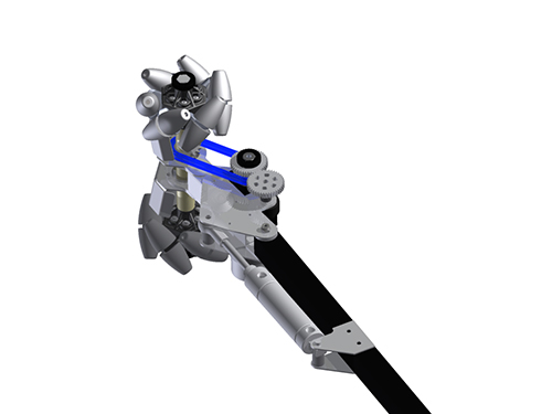 We needed enough force to hold the can even when the acceleration of the moving robot or the weight of the can tries to force the can out of the mechanism’s grasp. We used tread that was fit taut to the jaws in three places to have a three point contact system going. This was working great until we realized that when receiving the can the holder would not have a perfect grip on the game piece because the friction of the tread and the crunching force of the pneumatics would force the can to be held a bit more forward than we designed it to. To help with the intake process we implemented wheels to create a gliding action that would accept the game piece while still providing three points of contact to securely hold the item.