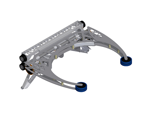 The drive base features a U shape design to allow the game totes to enter the front of the chassis before being collected by the can .It was designed to reduce weight, but maintain enough structure to withstand any impacts that could occur during a match. Designing a chassis of this particular shape proved to be challenging because it needed to maintain sturdiness while having the front of the right and left sides not directly connected. To increase the strength of the design we added multiple pontoons down the sides. This greatly improved the rigidity of the design which is very important because our robot would be carrying a very heavy stack of totes over uneven ground.