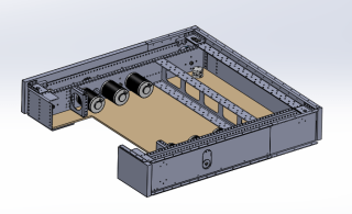 Our 2nd subsystem is our shooter. Our plan here is to be a 3 wide shooter that shoots from inside of the key. We are using 2 small drums to shoot the balls. Initial testing proved that we could get these drums up to speed quickly and power them with very little reduction from a 775pro. We are actually going to be driving these ~1.5in rollers using GT2 belts with a 1:2 reduction off the 775pro motors. This system will be tested more this coming weekend. We are waiting for the GT2 belts to come in from WCProducts. Our test version was only a single ball wide and was powered by 4 775pros that were all in VersaPlanetary gearboxes and chain to the rollers.