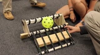 The main intake will be made from timing belts and WCProduct compliant wheels. Its job is to pull in balls throughout the match so we are ready to fire into the Boiler when the time comes. We are still working out pulley spacing, conveyor compression, etc. The design goal is that the balls come up the bottom of the hopper so that they push the balls above it up and out of the way. These balls appear to slide very nicely with each other so that should work well. The belts at the back of the conveyor are the first step in organizing the balls for the elevator. Balls held above the first layer will be able to fall in one of three tracks when entering the elevator. This may mean that our left and right channels have access to a few more balls then the center channel. We also plan to work out a way to agitate our ball hopper area to move balls on top of the first layer so they will rest into one of the three channels.