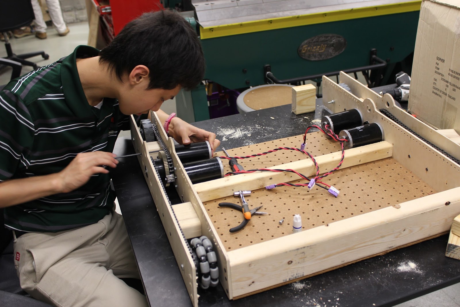 Below you can see the wooden version of the drive train we made on our router to make sure our chain clearances, spacing, etc are all the way we want them.