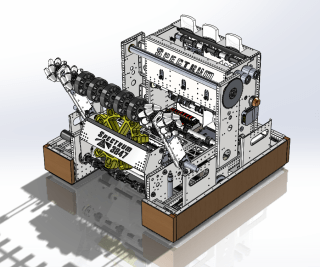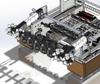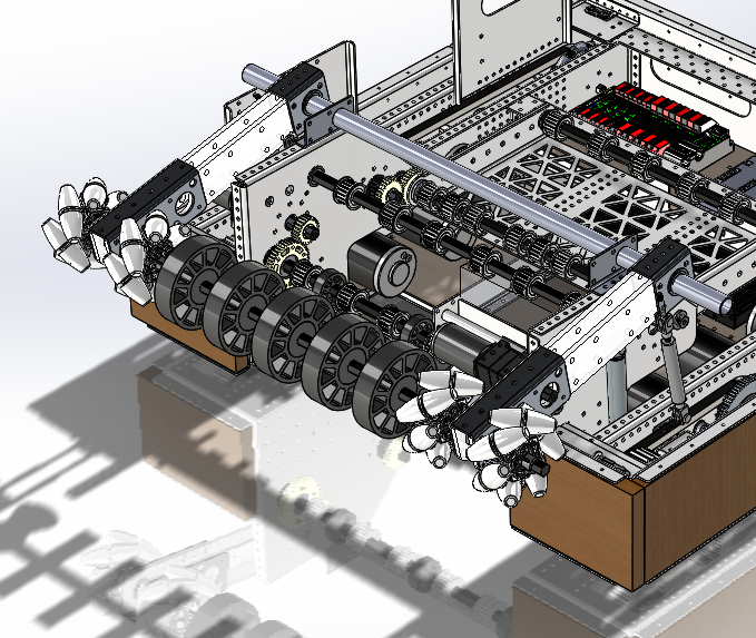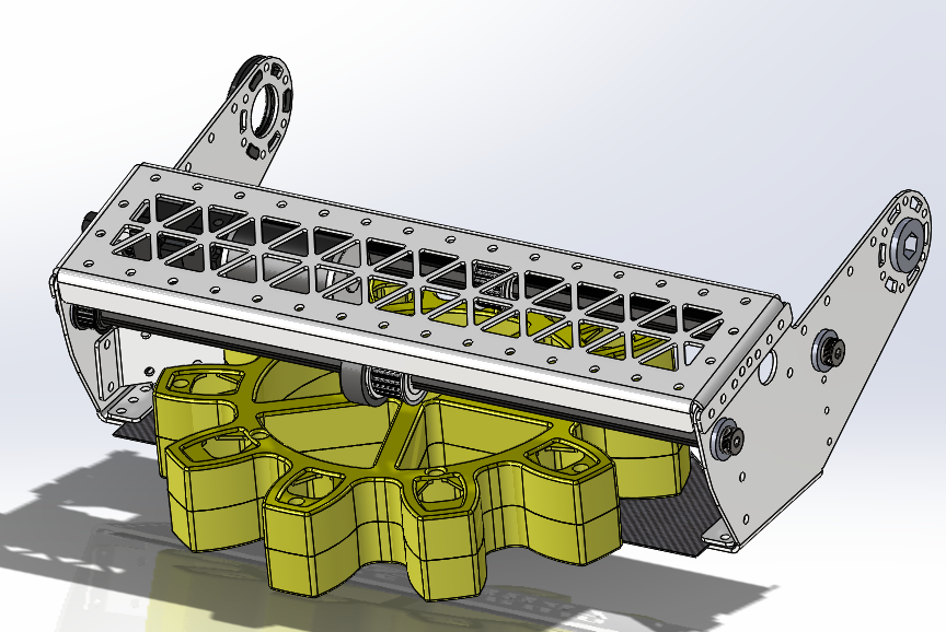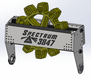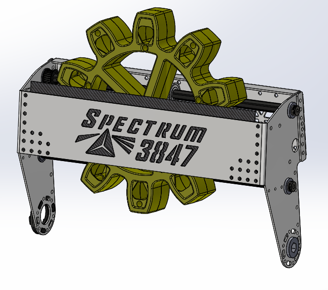 Our gear intake subsystem showed the most improvement over the weekend. It’s a simple solution to a complex problem. The main concept is a thin material slides under the edge of the gear and then a roller brings the gear into place. We are using a BAG motor with a Versaplanetary to power the roller and another BAG motor and Versaplanetary to raise and lower the entire mechanism. This mechanism folds down between the bumper gap that is open for our Fuel intake.