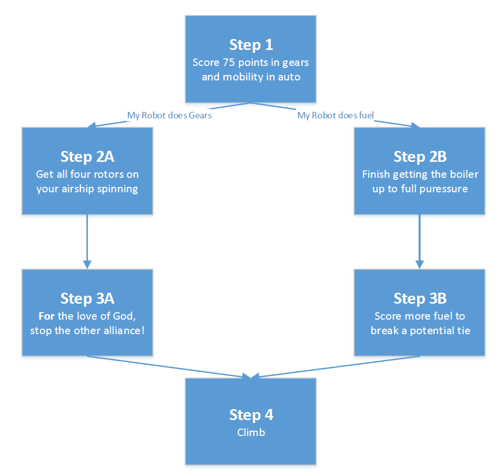 STEAMWorks high level play follows a fairly standard strategy that can vary in execution depending on an alliance’s makeup. At the end of a playoff match you need to satisfy the following conditions to win: