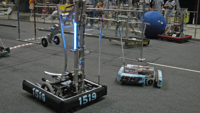 Now, let’s take a step back in time to the 2008 FIRST Robotics Competition game, FIRST Overdrive. You launched a massive ball over a hurdle and drove in circles, no seriously. Watch the game animation. Some teams realized if they drove really fast they could outscore most hurdlers, and one of them took it to the Championship Finals and won it big.